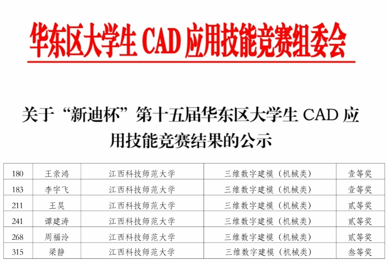 近日,“新迪杯”第十五届华东区大学生CAD应用技能竞赛公示获奖名单。我院方军博士带领8位学生参赛,获一等奖2项,二等奖3项,三等奖1项的优异成绩。