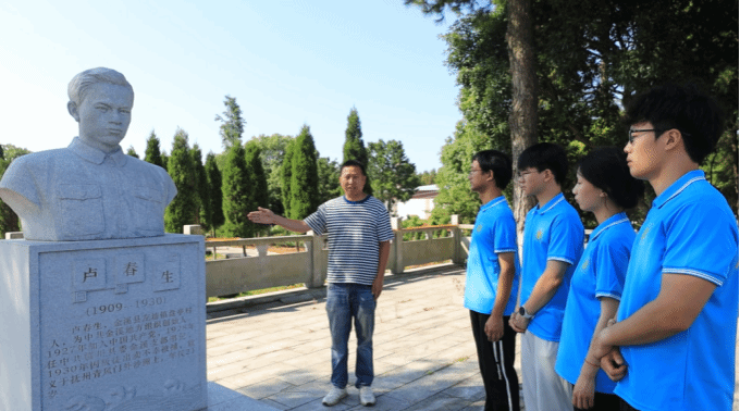 巍峨的纪念碑矗立于层叠绿意之中,斑驳石纹铭刻着峥嵘岁月。纪念碑顶飘扬的五星红旗,在阳光下闪耀着信念的光芒。静默的风穿过林梢,带来遥远的回响,仿佛历史的长河在此驻足。金溪县退役军人事务局优抚股长王建华肃立于卢春生烈士塑像旁,为实践队员们动情讲述其英雄事迹。塑像基座下方三行生平简述,在金色的阳光下折射出历史的千钧重量,每一字句都重若千钧,诉说着不朽的忠诚。