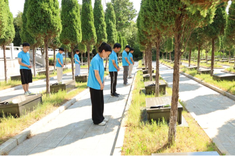 怀着对革命先辈最深的崇敬,十二名队员神情庄重,缓步上前,全队向长眠于此的英烈敬献鲜花。洁白的菊花在静穆中无声绽放,每一瓣都承载着队员们无尽的追思与景仰。全体队员整齐肃立,在纪念碑前深深垂首默哀。现场庄严肃穆,唯有山风穿过松林,枝叶低鸣,如历史的低语在陵园上空回荡,将那段烽火硝烟、壮怀激烈的岁月重现眼前。三分钟的静默,是对英魂最深沉的致敬,凝聚着无限的追忆与哀思,让年轻的心灵在无声中感受信仰的分量。苍翠的松柏与肃穆的静默,共同镌刻下这庄严的缅怀。